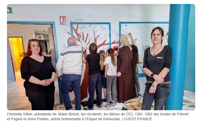 Fresque intergénérationnelle en breton avec les élèves bilingues de Prévert et Pagnol et les résidents Organisation : Sklaer Breizh Article OF : https://www.ouest-france.fr/bretagne/ploemeur-56270/une-fresque-intergenerationnelle-en-trois-langues-realisee-a-lehpad-de-kerloudan-a-plmeur-4c36e438-2561-11f1-bd9e-1f8a3e3fb0ac